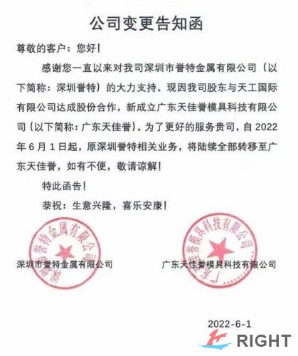 尊敬的客戶(hù),您好! 感謝您一直以來(lái)對(duì)我司深圳市譽(yù)特金屬有限公司(以下簡(jiǎn)稱(chēng)譽(yù)特)的大力支持,現(xiàn)因我司股東與天工和國(guó)際有限公司達(dá)成股份合作,新成立廣東天佳譽(yù)模具科技有限公司(以下簡(jiǎn)稱(chēng)廣東天佳譽(yù))。為了更好的服務(wù)貴司,自2022年6月1日起,原深圳譽(yù)特相關(guān)業(yè)務(wù)將陸陸續(xù)轉(zhuǎn)全部轉(zhuǎn)移至廣東天佳譽(yù),如有不便,敬請(qǐng)諒解。