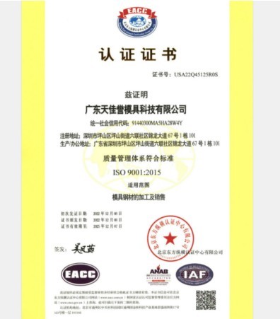 廣東天佳譽(yù)模具科技有限公司是由香港上市公司天工國(guó)際和深圳市譽(yù)特金屬有限公司股東于2022年4月共同出資成立的集模具鋼研發(fā)、生產(chǎn)、銷(xiāo)售、模具熱處理、機(jī)加工為一體的模具科技企業(yè),通過(guò)了ISO9001:2015質(zhì)量體系管理認(rèn)證,是深圳市龍崗區(qū)壓鑄行業(yè)協(xié)會(huì)第二屆理事單位,并獲得了由中鑄科技頒發(fā)的“壓鑄模具鋼材十強(qiáng)”榮譽(yù)證書(shū)。
